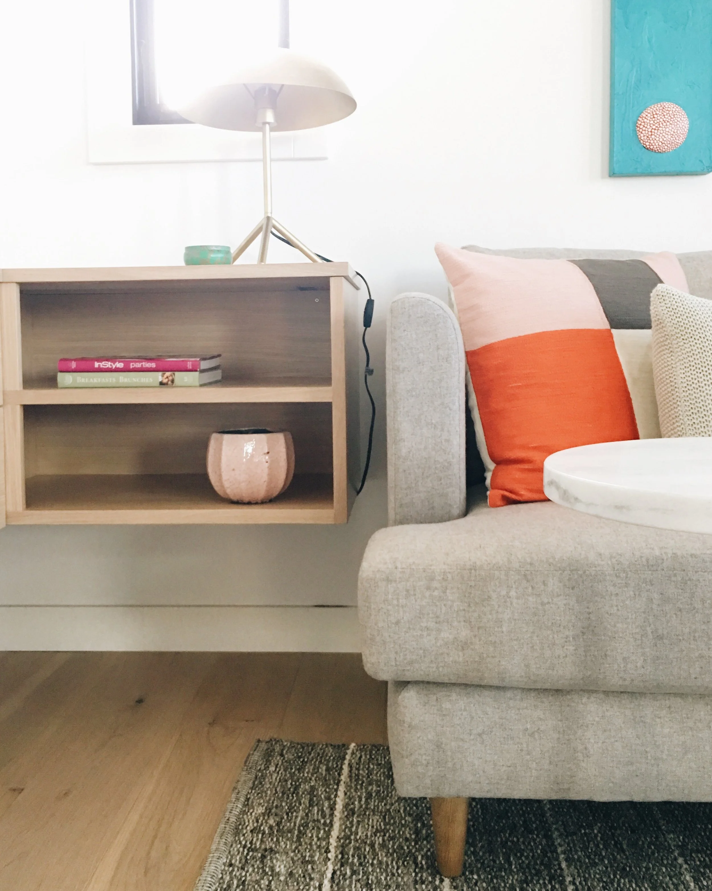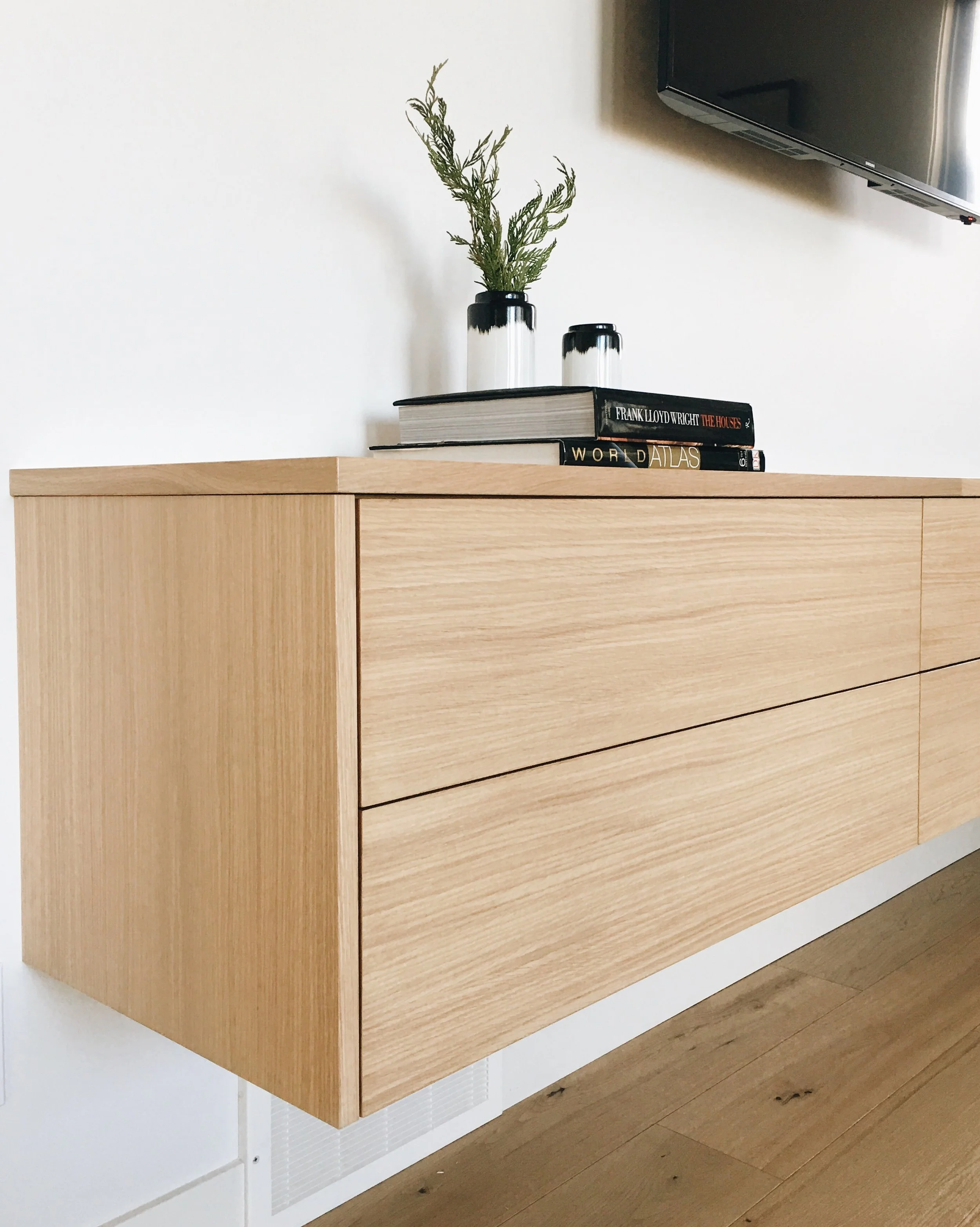 A custom floating console sits under the television and wraps around the corner to provide a table for the sectional.