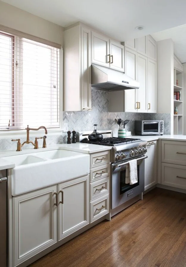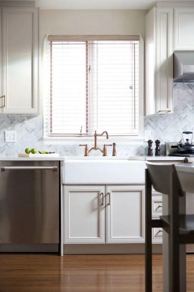 A light filled area of the kitchen with cast iron apron sink and copper bridge style faucet.