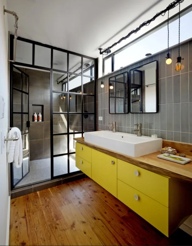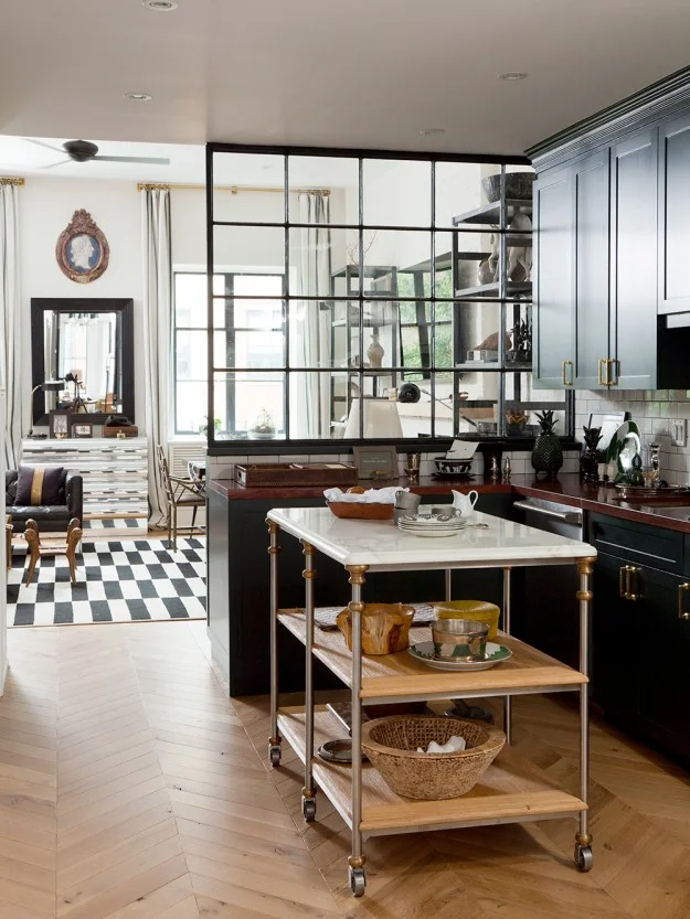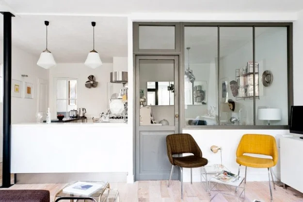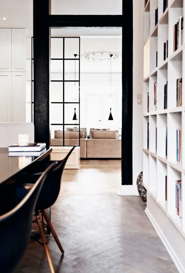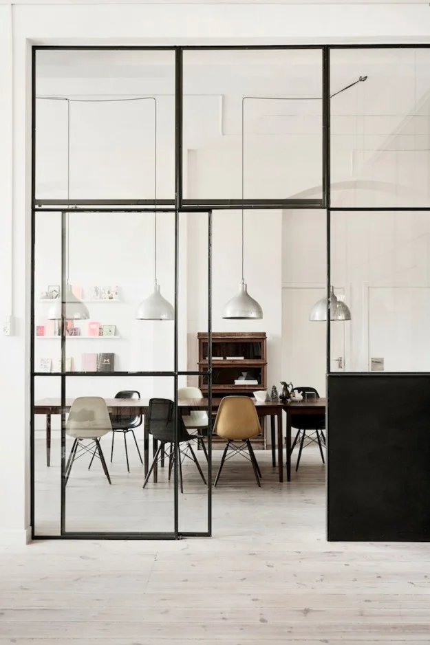 I’ve noticed a trend in the treatment of interior walls recently and I’m kind of obsessed. Not just a divider of space, but a way to define as well as allow the passage of light and a view into adjoining rooms. Framed with bold lines, these interior windows frame a space in a non traditional way. As seen below, everything from a shower wall, dining rooms, kitchens, and living areas all benefit from this light filled, ‘see-though’ wall. I love it.