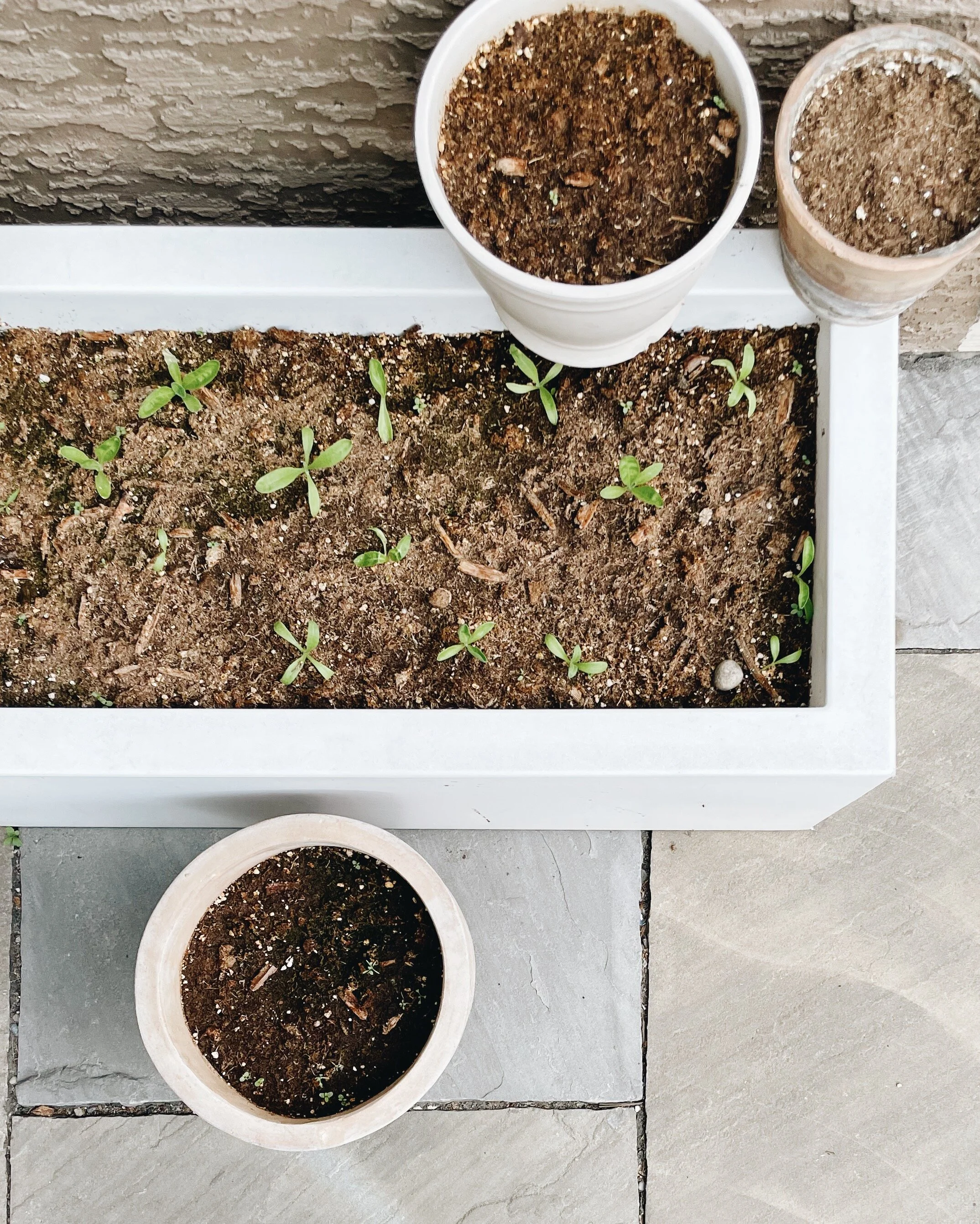 Above, I moved the smaller planters up off the floor so Ivy couldn’t indulge in the soil. I think I was too late in doing so as the seeds didn’t amount to anything. In the larger, rectangular planter, the calendula is starting to sprout!
